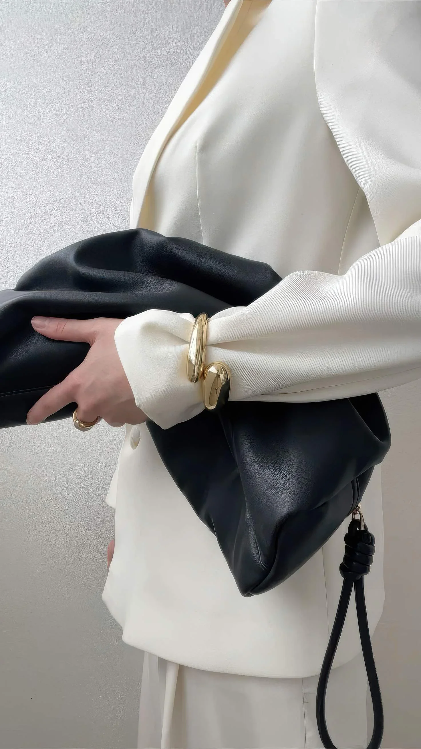Persoon vasthoudt een zwart leren tasje, gekleed in een witte blouse met gouden sieraden, voor een witte achtergrond.